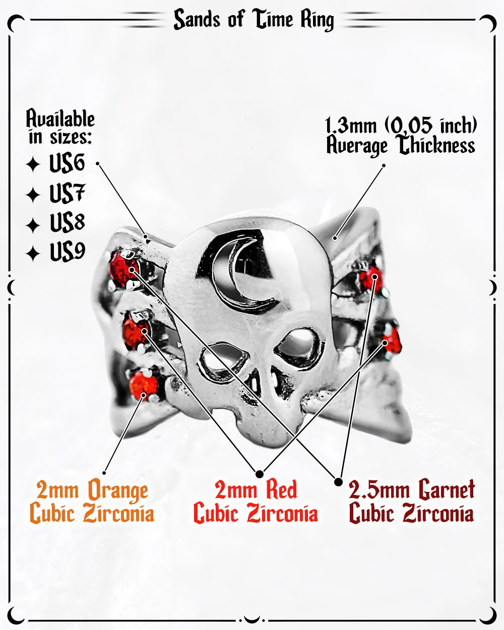 A magical Stainless Steel Ring with a Mirror Polish finish, decorated with an explosion of gemstones in deep reds and oranges, nestled upon the timelines like embers of a burned out star.