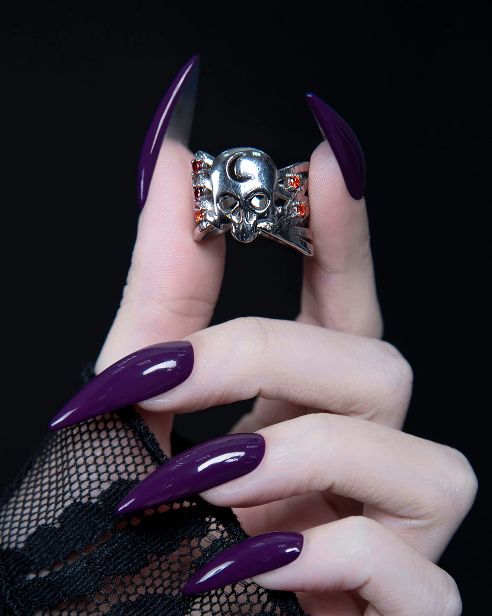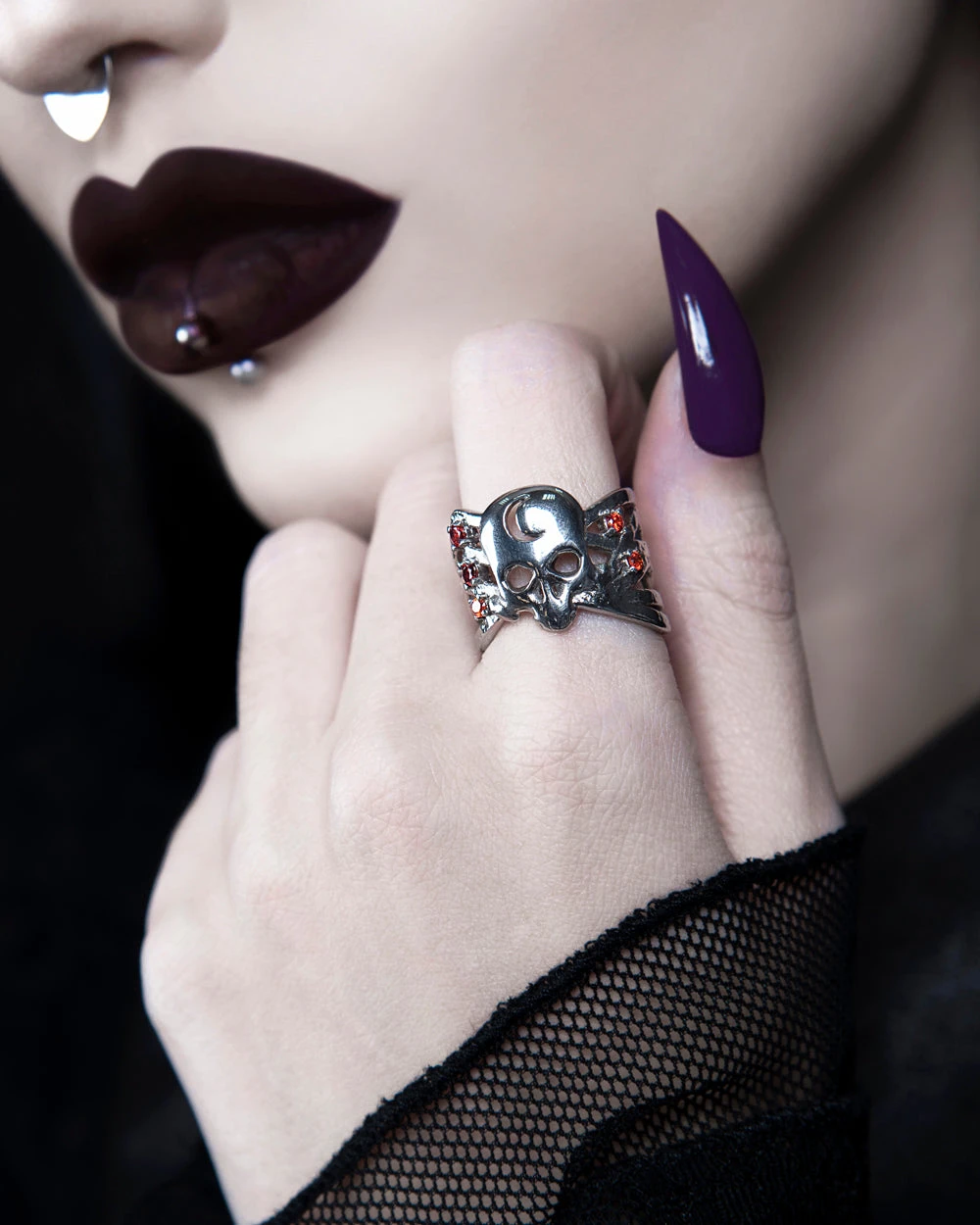 A memento mori ring of a skull marked by the crescent moon. Stars orbit around it, connecting you with the unimaginable vastness of spacetime.