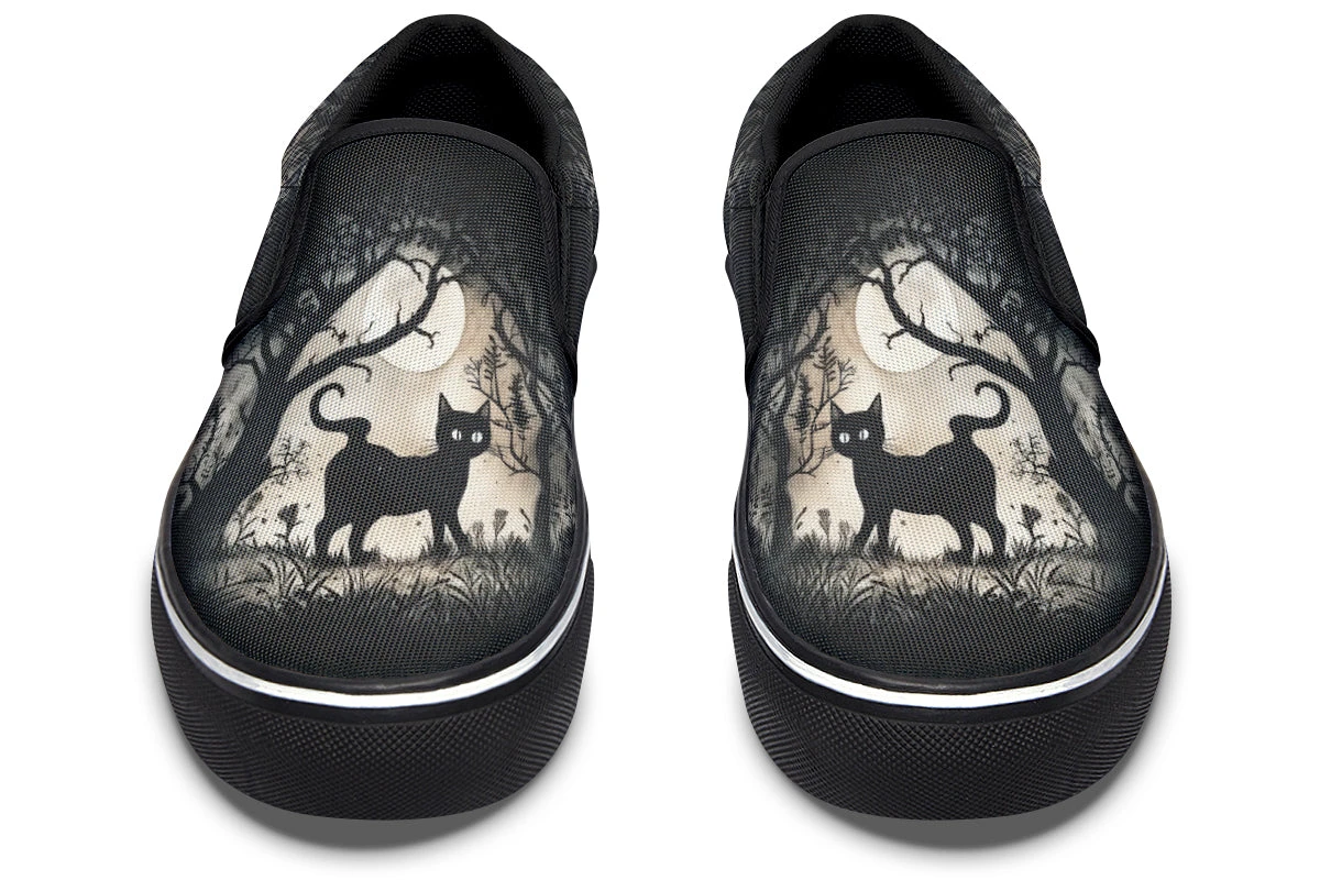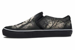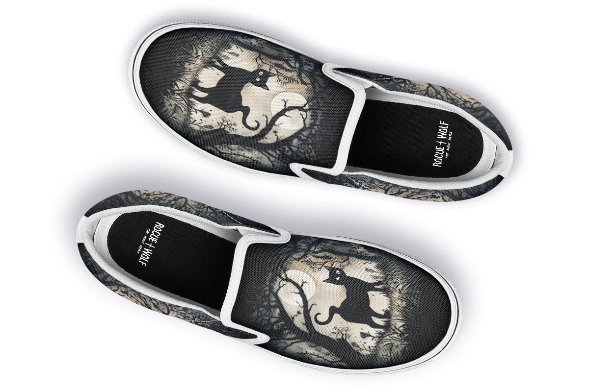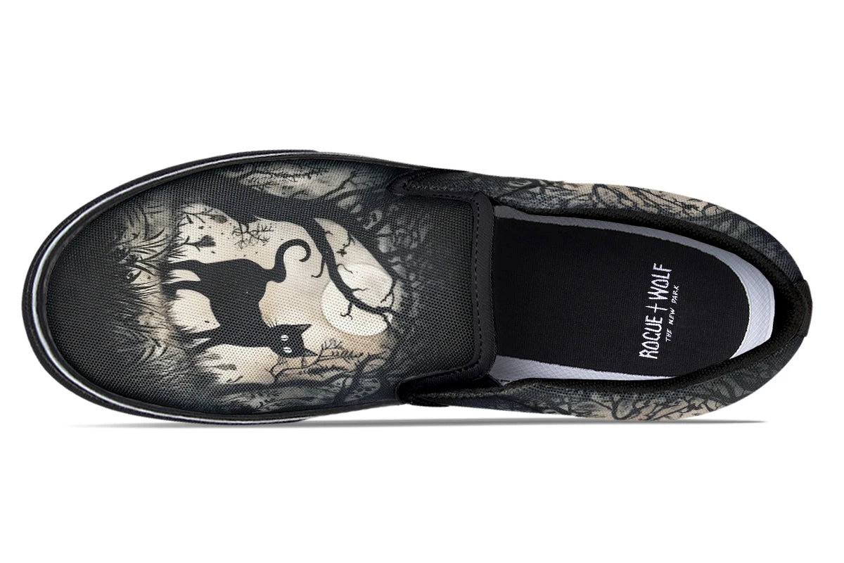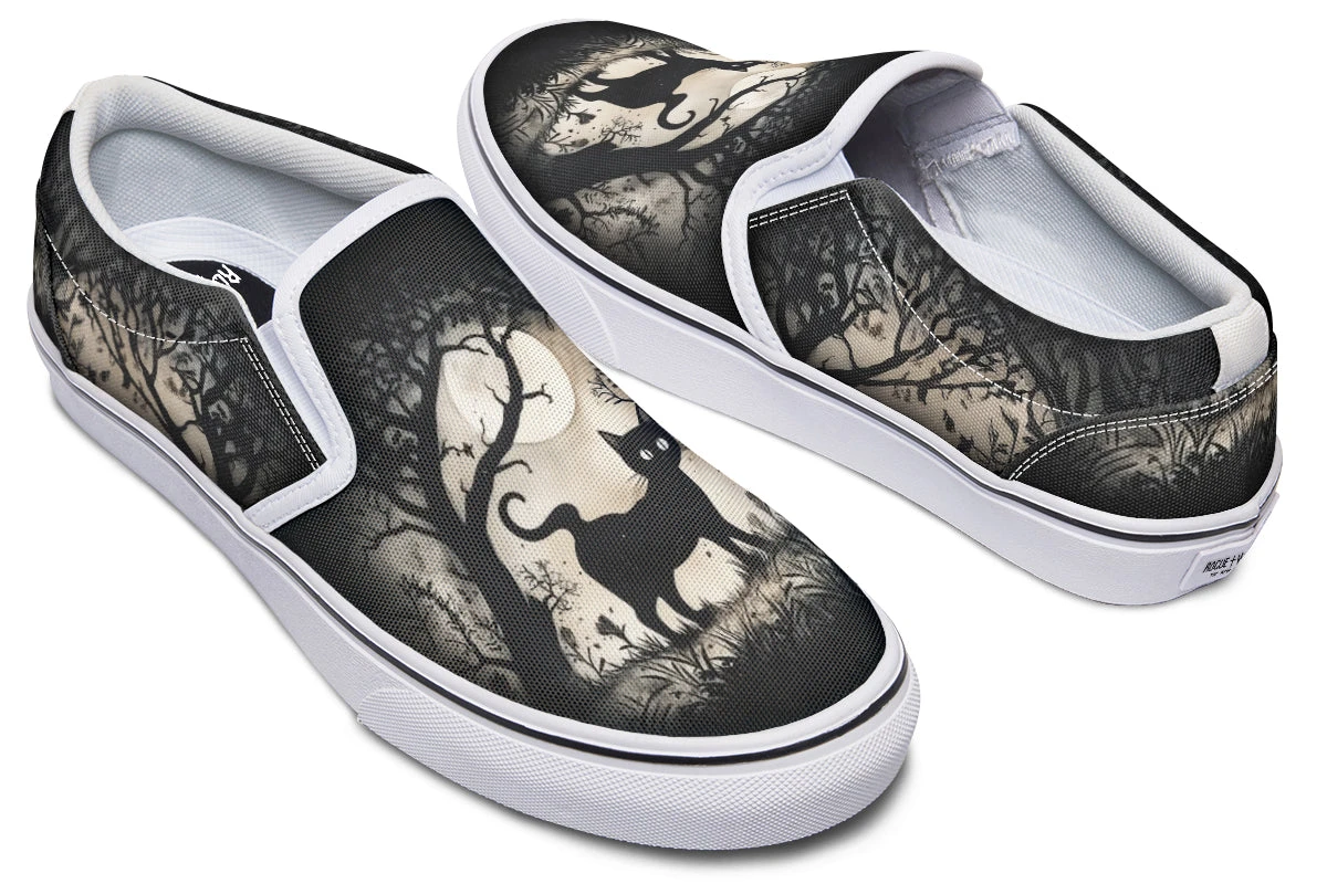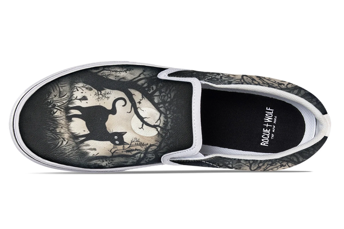 Step into the enigmatic night with Shadows And Whiskers Slipons, where a black cat prowls beneath gnarled trees bathed in moonlight magic. This gothic delight captures the very soul of a haunted evening, perfect for divining the future or just jazzing up an otherwise mortal OOTD!
