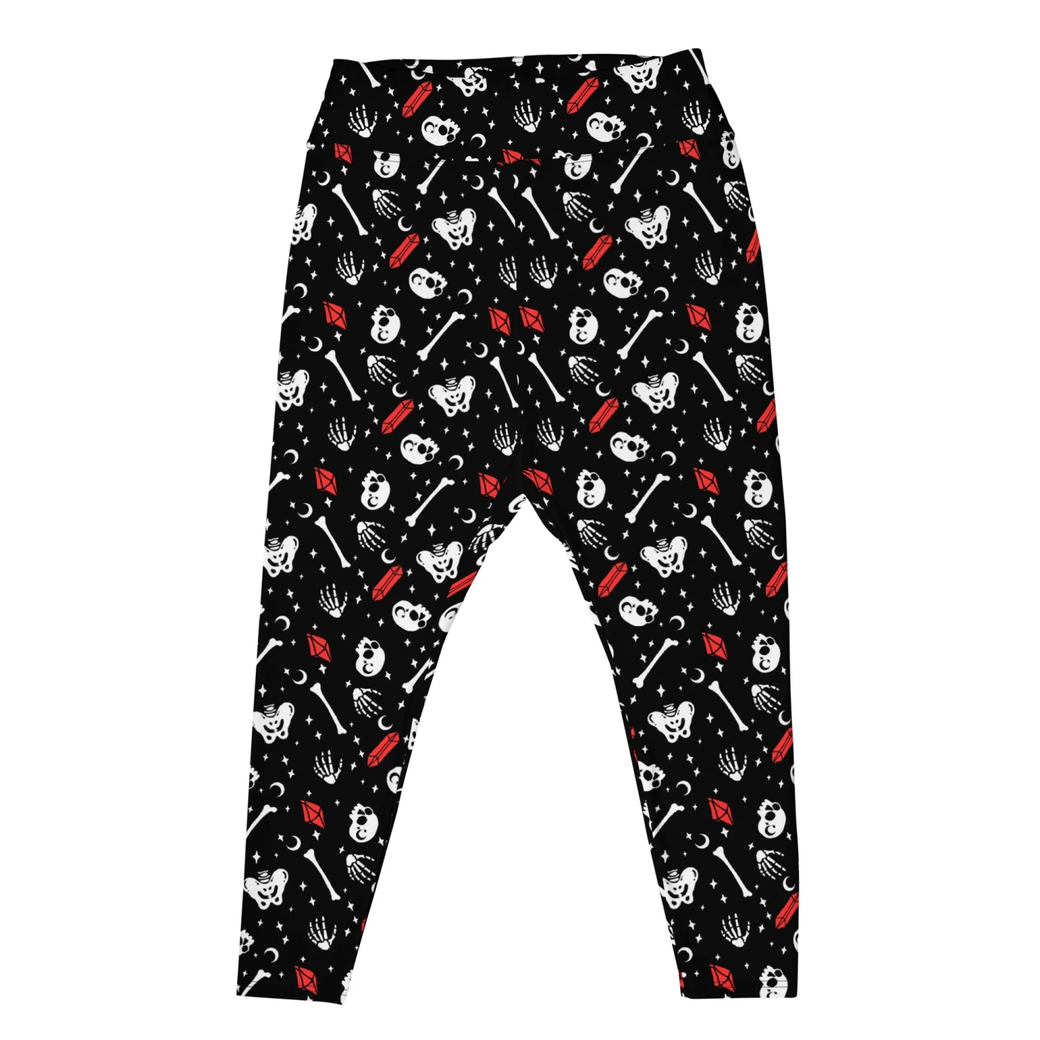 Embark on a midnight enchantment with our Skulls & Crystals Plus Size Leggings. Draped in a mesmerizing pattern of crystals, skulls, and bones amidst celestial wonders, these leggings capture the essence of a starlit grunge fantasy.