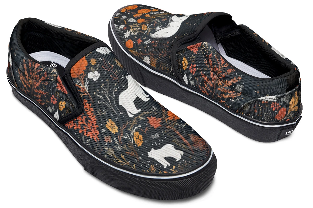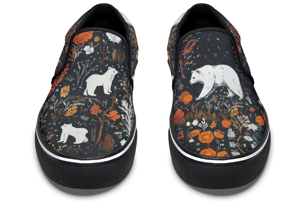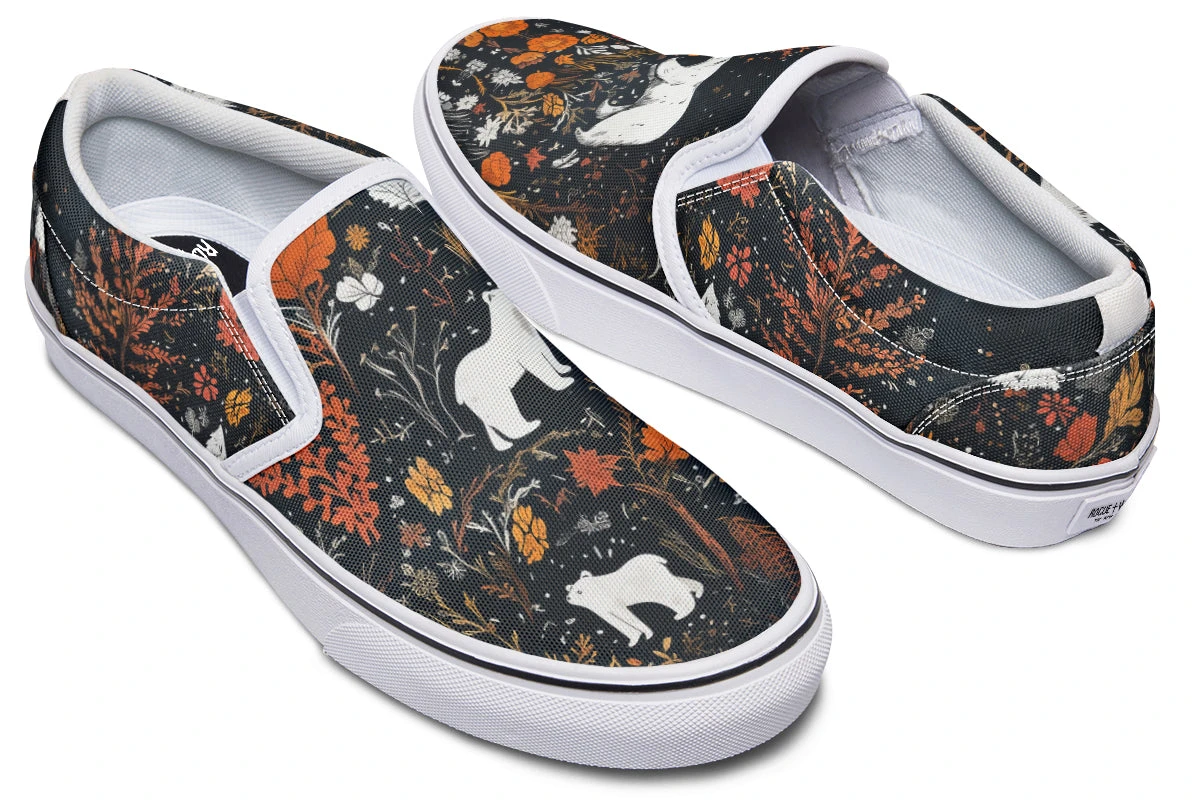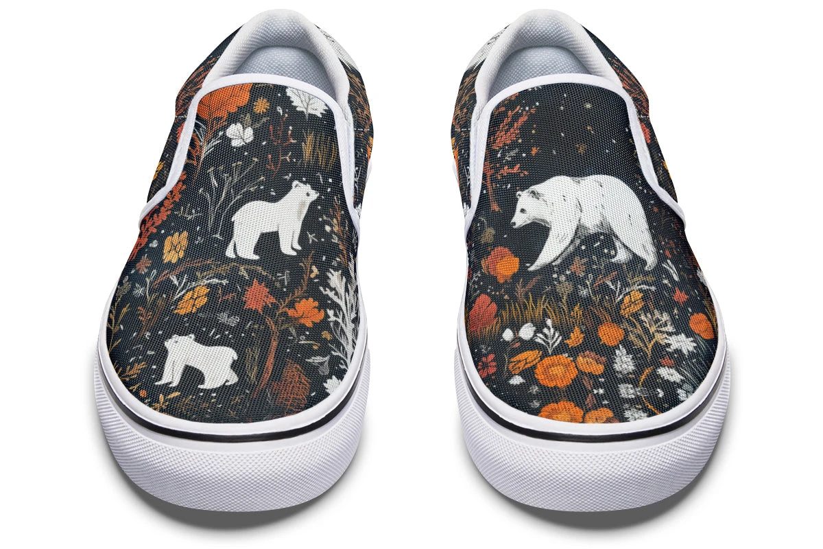 Immerse yourself in the mystical world where a ghostly white bear roams through an enchanted forest under a twilight sky. These Spirit Guardian Slipons invite you to wander in a serene, hidden wilderness, where nature meets myth and every step whispers magic.
