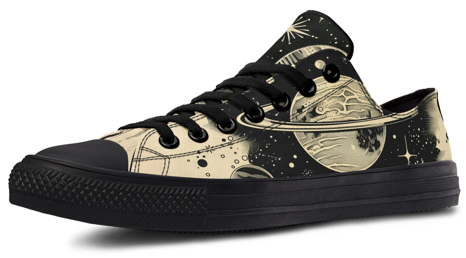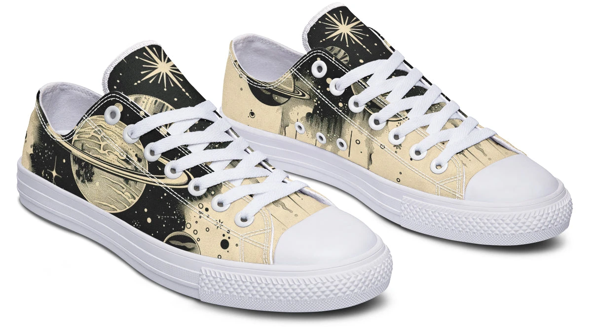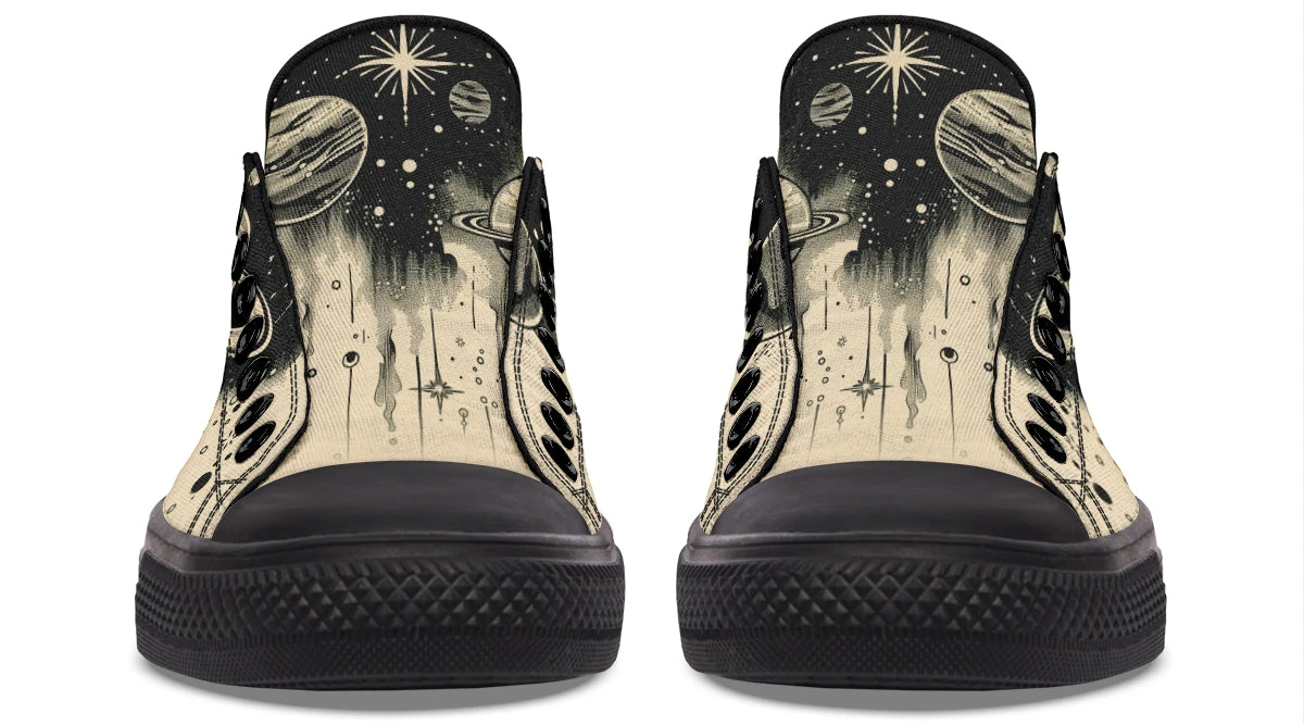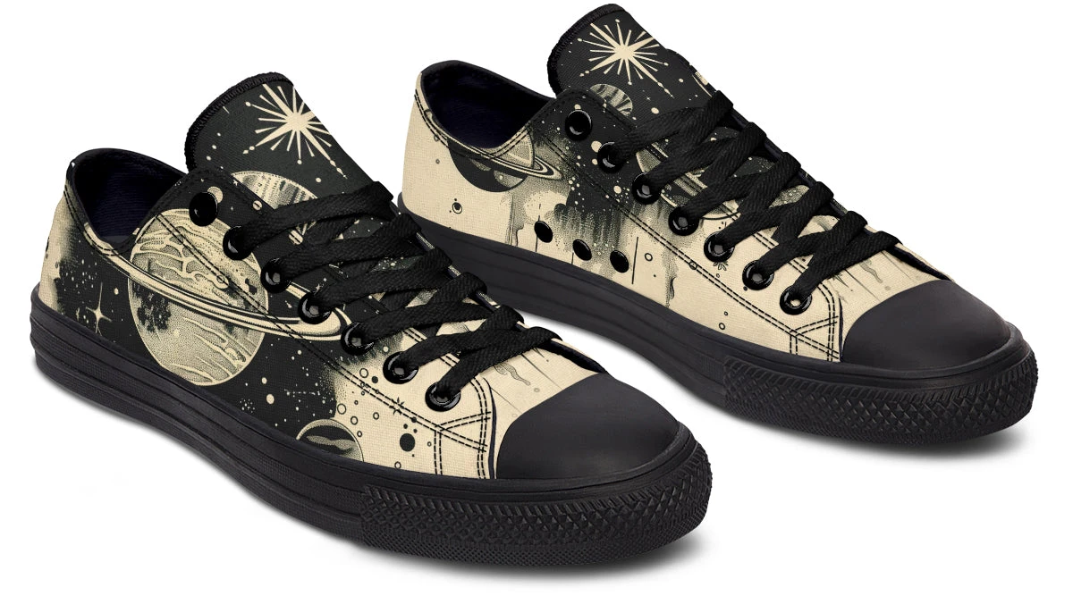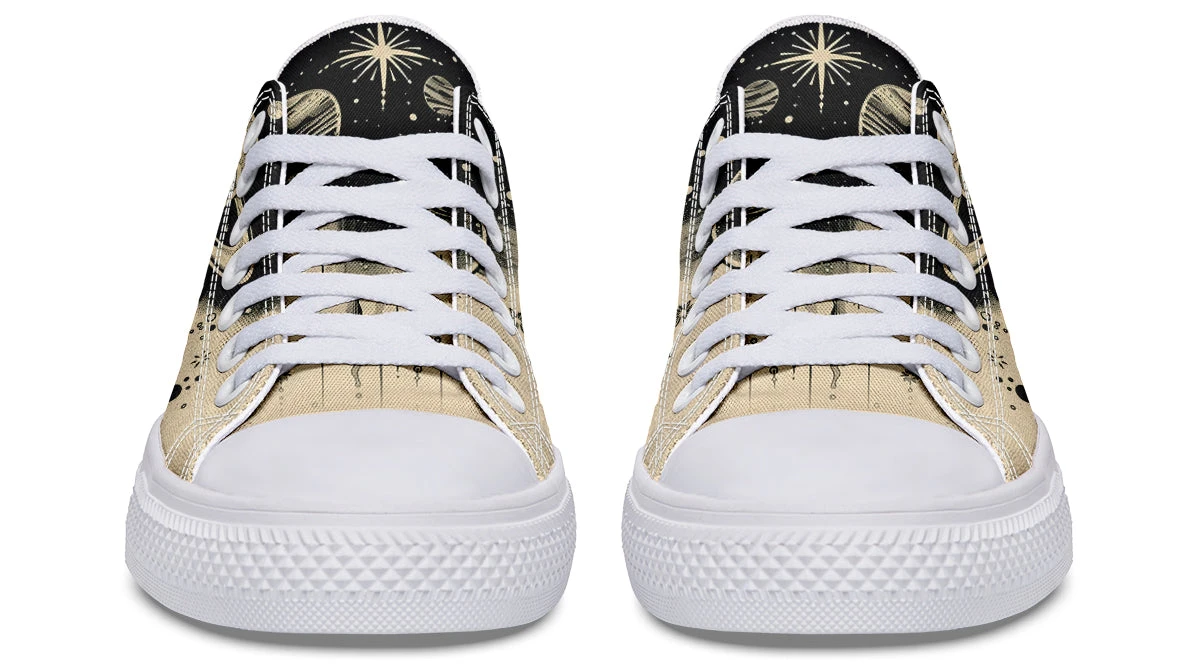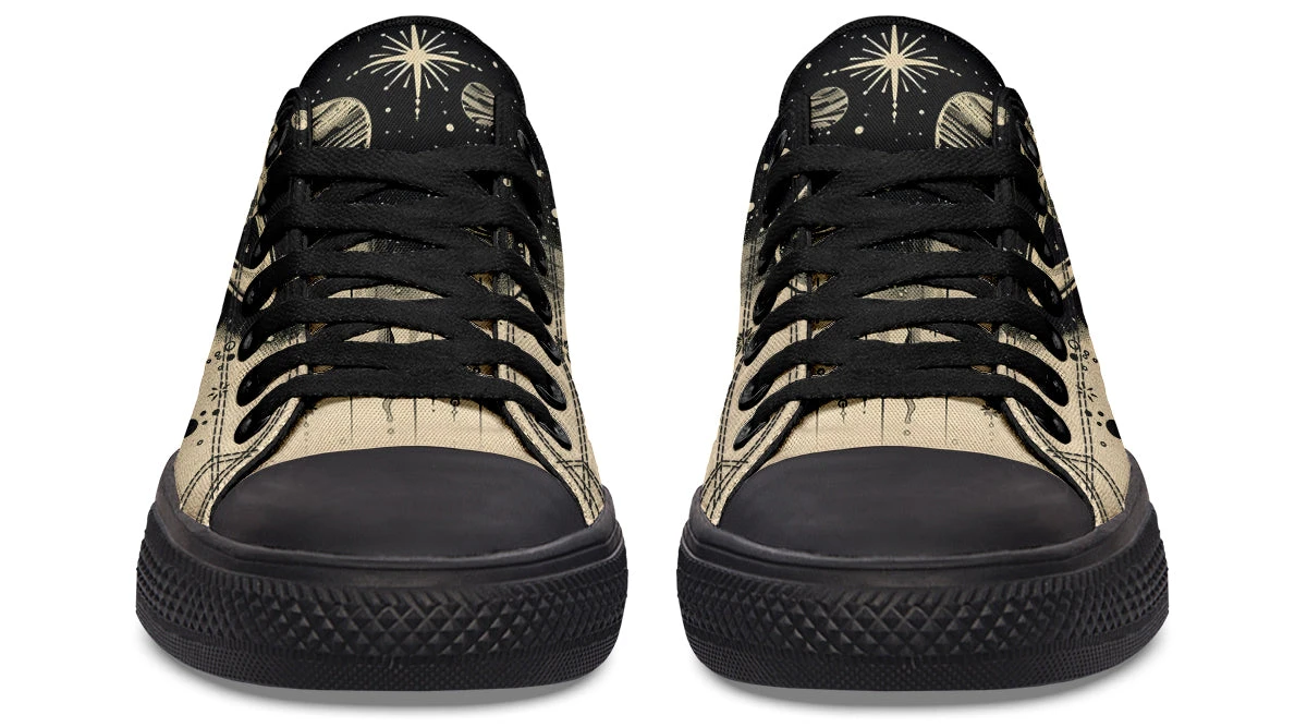 Wander among the stars and planets with every step in these casual low tops, inviting a cosmic journey right beneath your feet. The perfect blend of gothic charm and celestial wonder, these shoes capture the essence of night skies painted on a canvas of black on beige. The Starwalker Low Tops are a portal to the universe, promising adventures unknown.