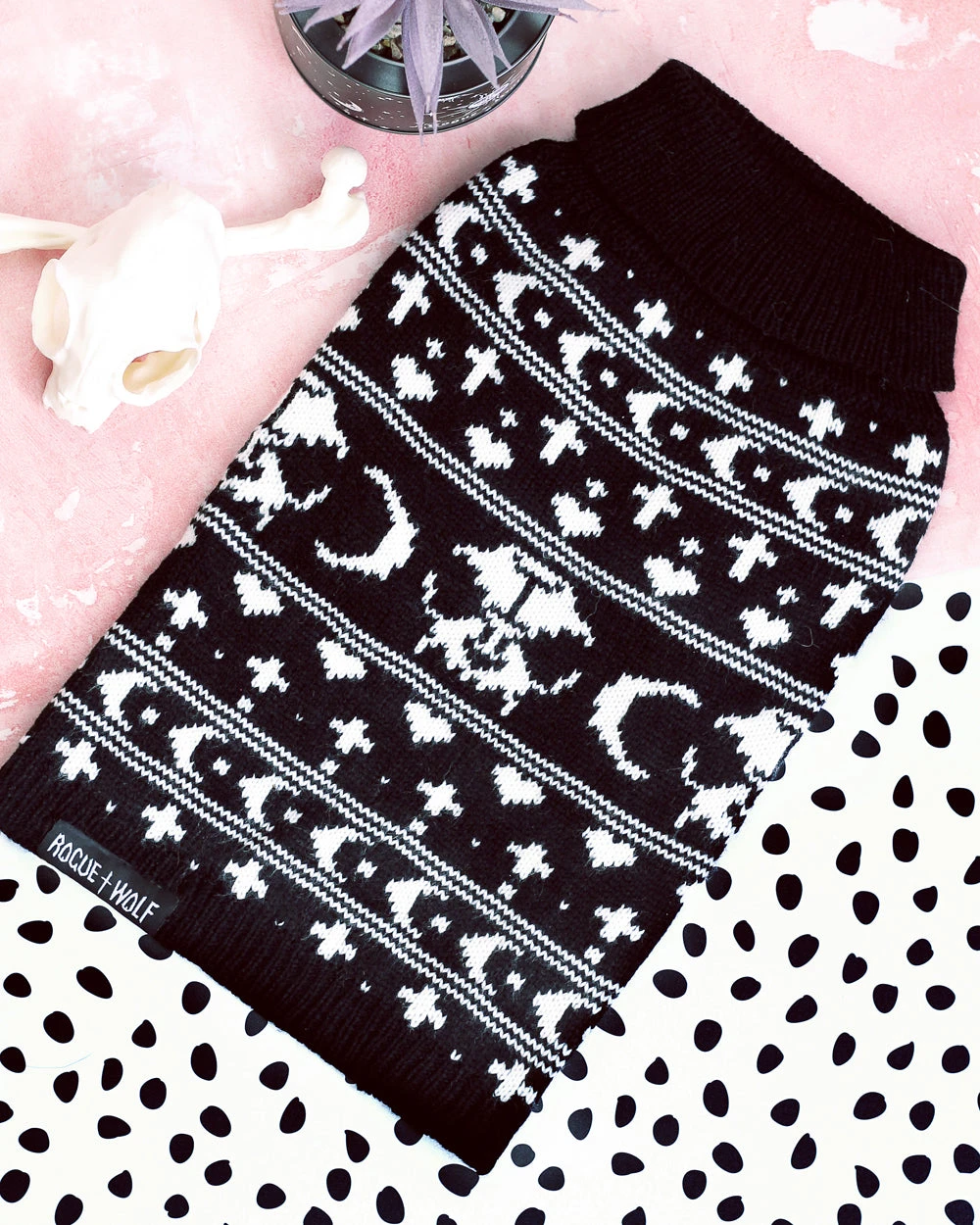 A lush black & white sweater knitted with soft Vegan acrylic Yarn, with a creepy-cute pattern of cat skulls, AKA the eternal enemy! Stars, hearts & crosses allova too! Pullover with ribbed roll-neck and cuffs.Â