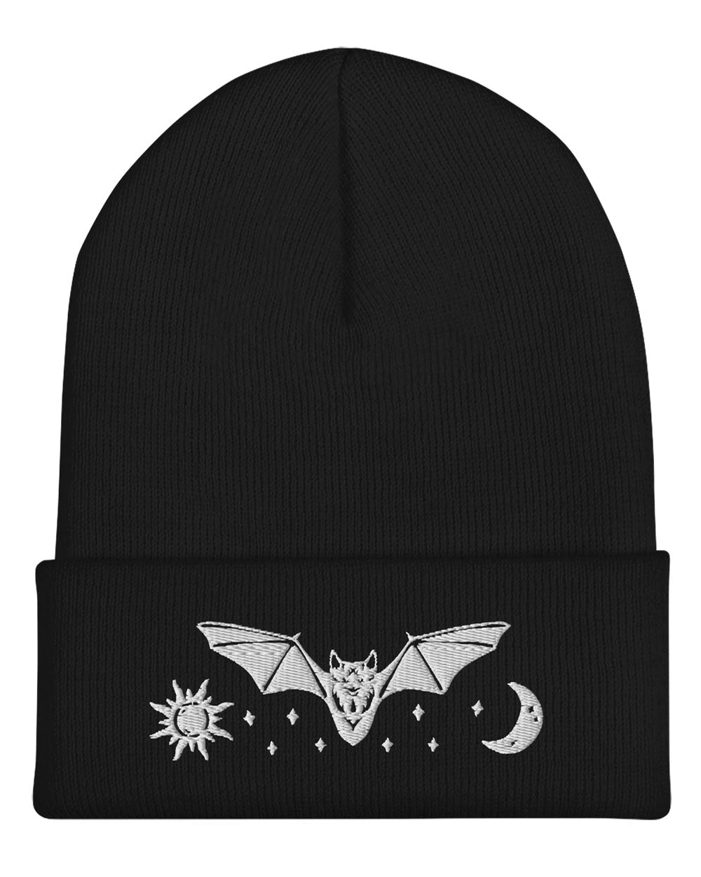 Yes, nestled between the sun and moon, a bat unfurls its wings, adding a dash of daring to our enchanting twilight panorama on our unisex style beanie It’s the perfect accessory to crown your alternative fashion, and a testament to our #GothicStyle and #DarkAcademia vibes. Plus, it’s like wearing a mini sunset on your head – just without the annoying solar flares!
