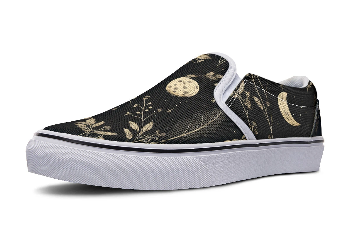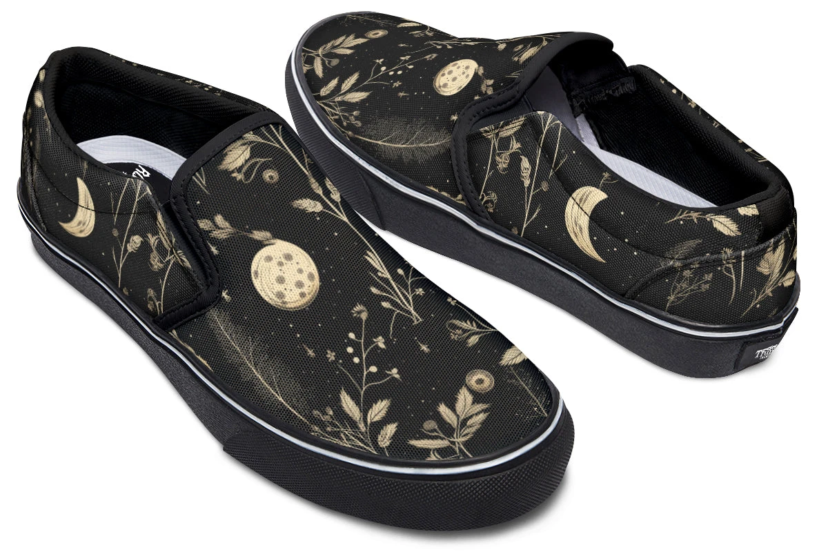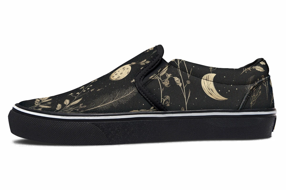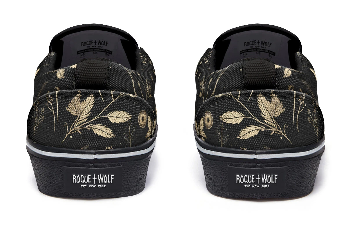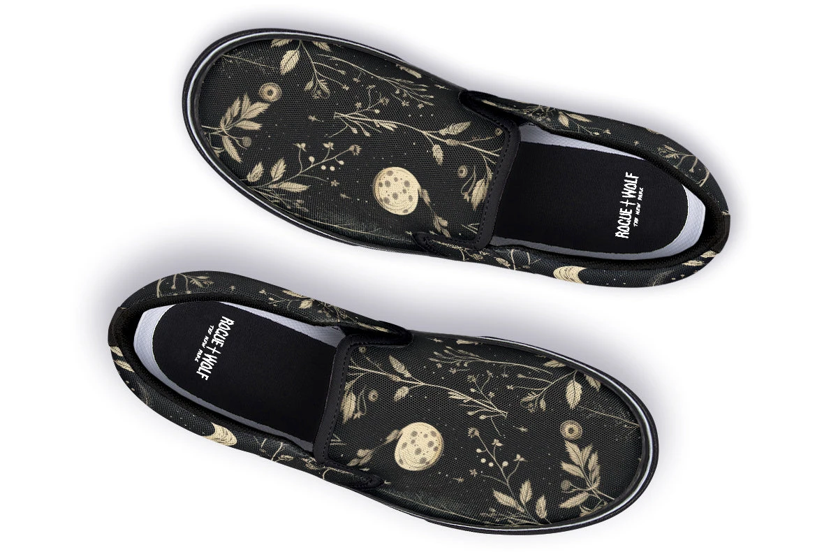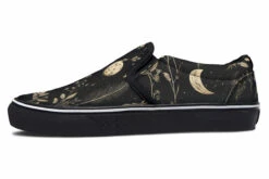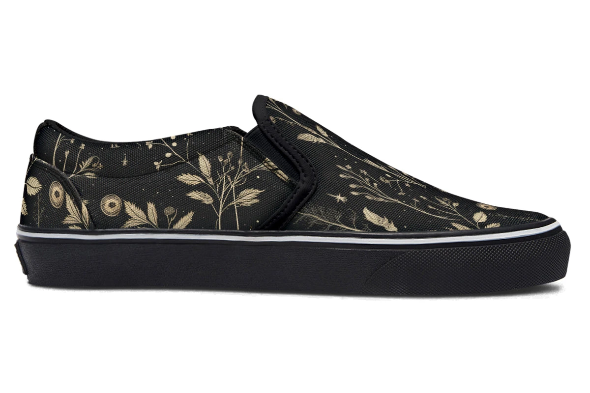 Unveil your mystical side with Twilight Garden Slipons, where the secrets of the night sky and an alchemist’s garden meet. This enchanting mix of herbs, leaves, and seeds on an inky black canvas captures the spirit of twilight magic, ready to take your style to otherworldly heights.