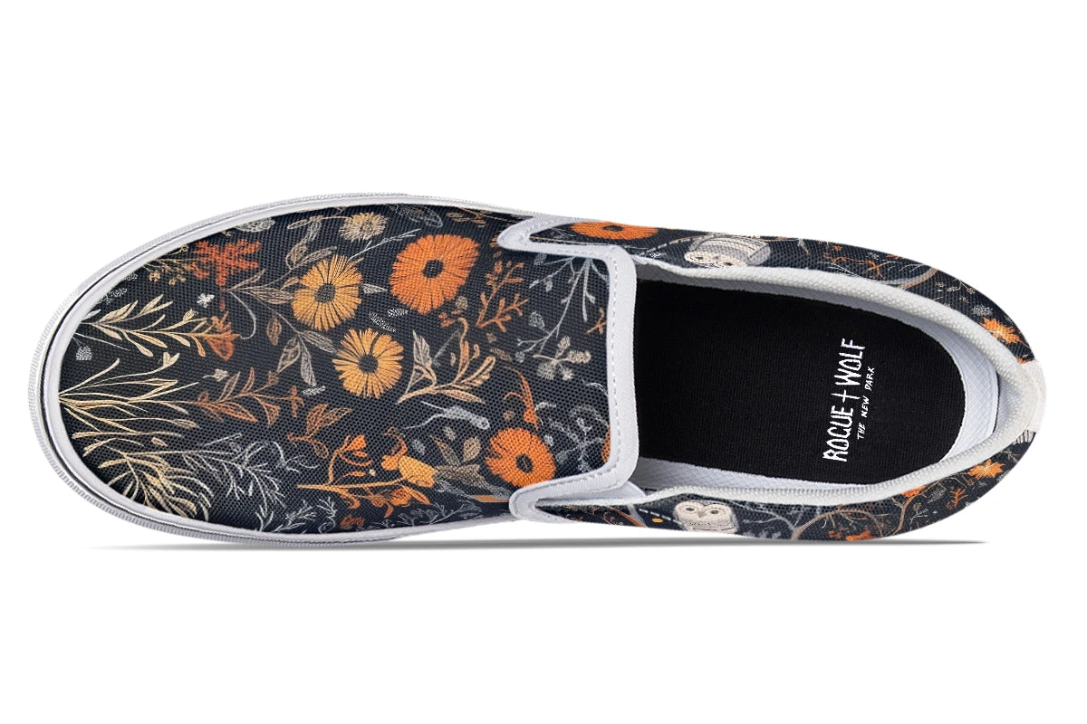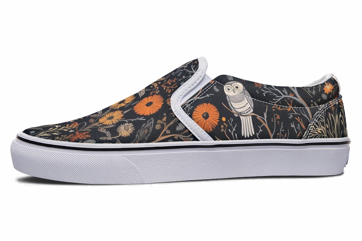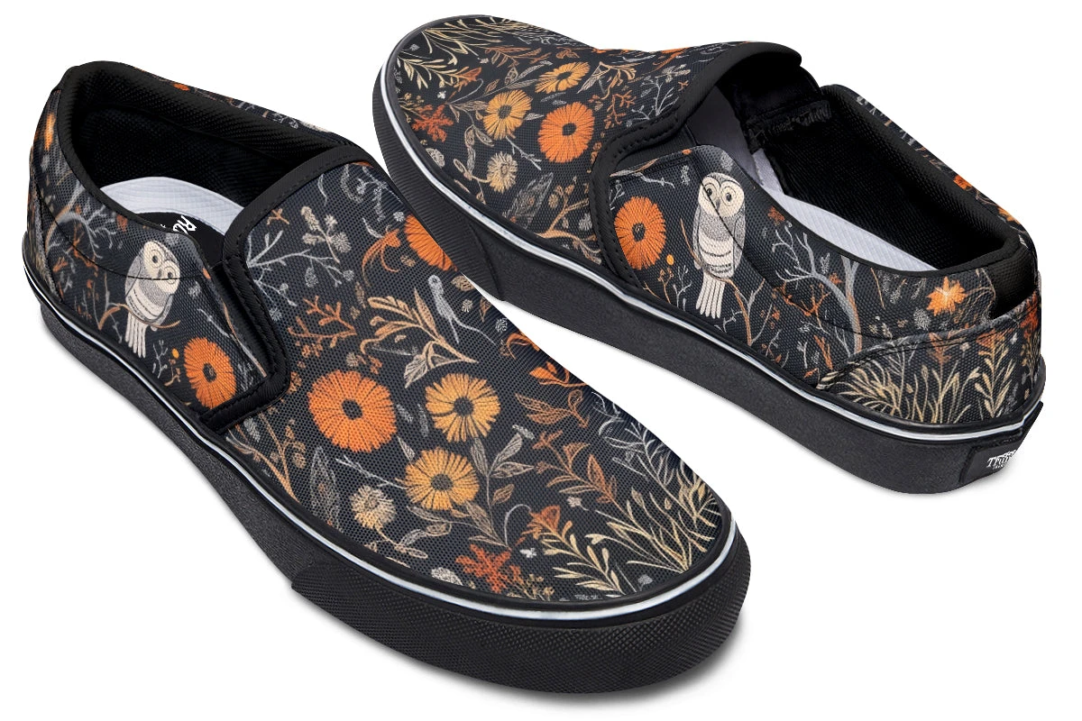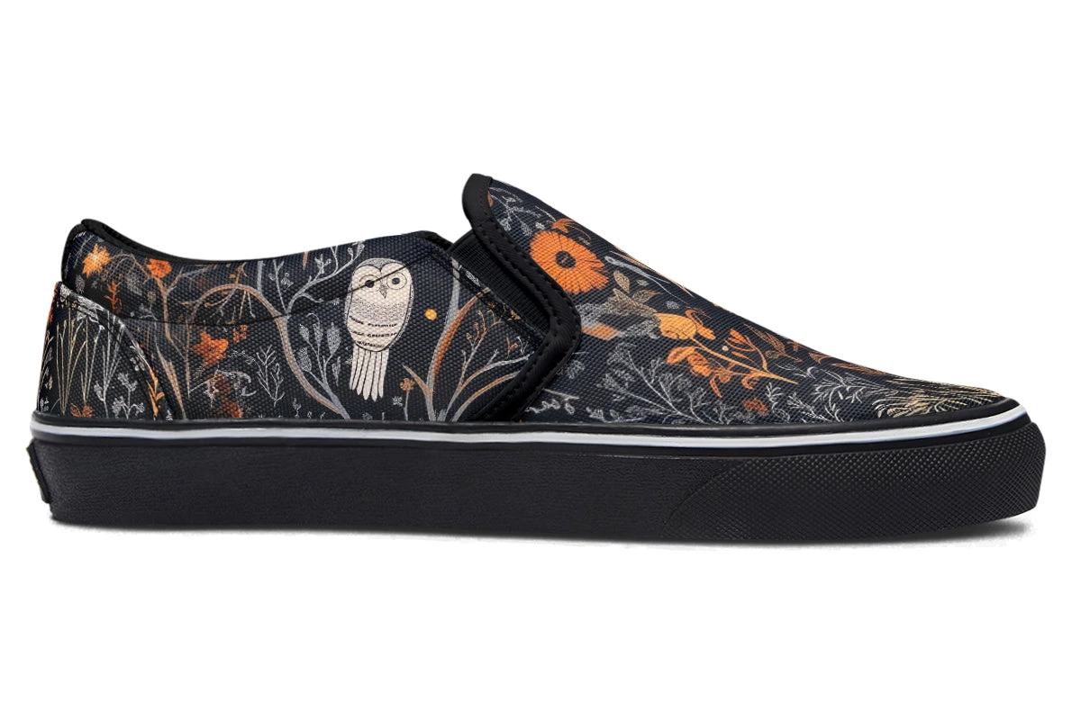 Channel your inner night creature with our Twilight Watcher Slipons, where a ghostly white owl keeps watch from its perch among ember-like blossoms against the midnight sky. Bring a touch of witchy calm and eerie beauty to your every step, as you glide through the urban forest or a midnight stroll.