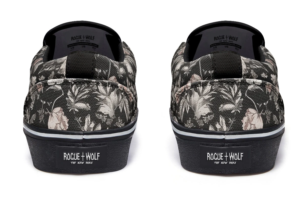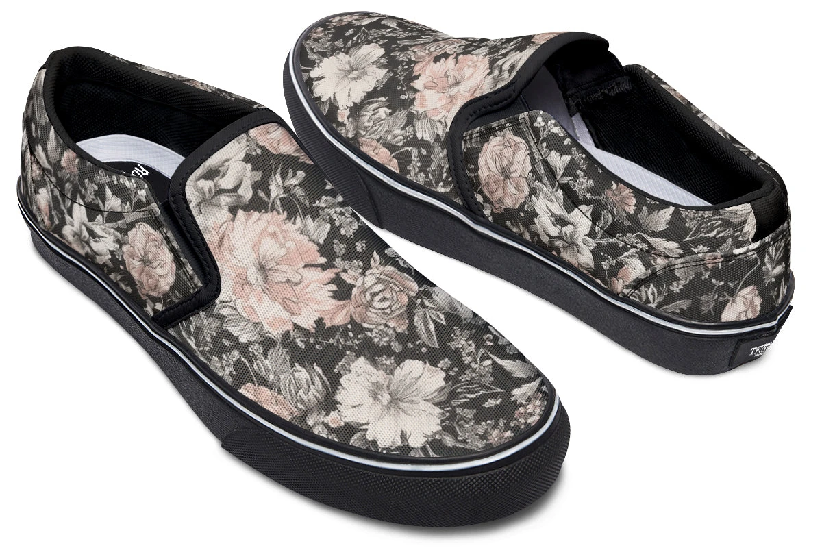 Transport yourself to an enchanted garden where vintage romance blooms with every step. These slipons adorn your feet with a tapestry of nostalgic peonies in soft pinks and earthy tones, set against a backdrop as dark as a witch’s midnight brew. Perfect for conjuring smiles and turning heads.