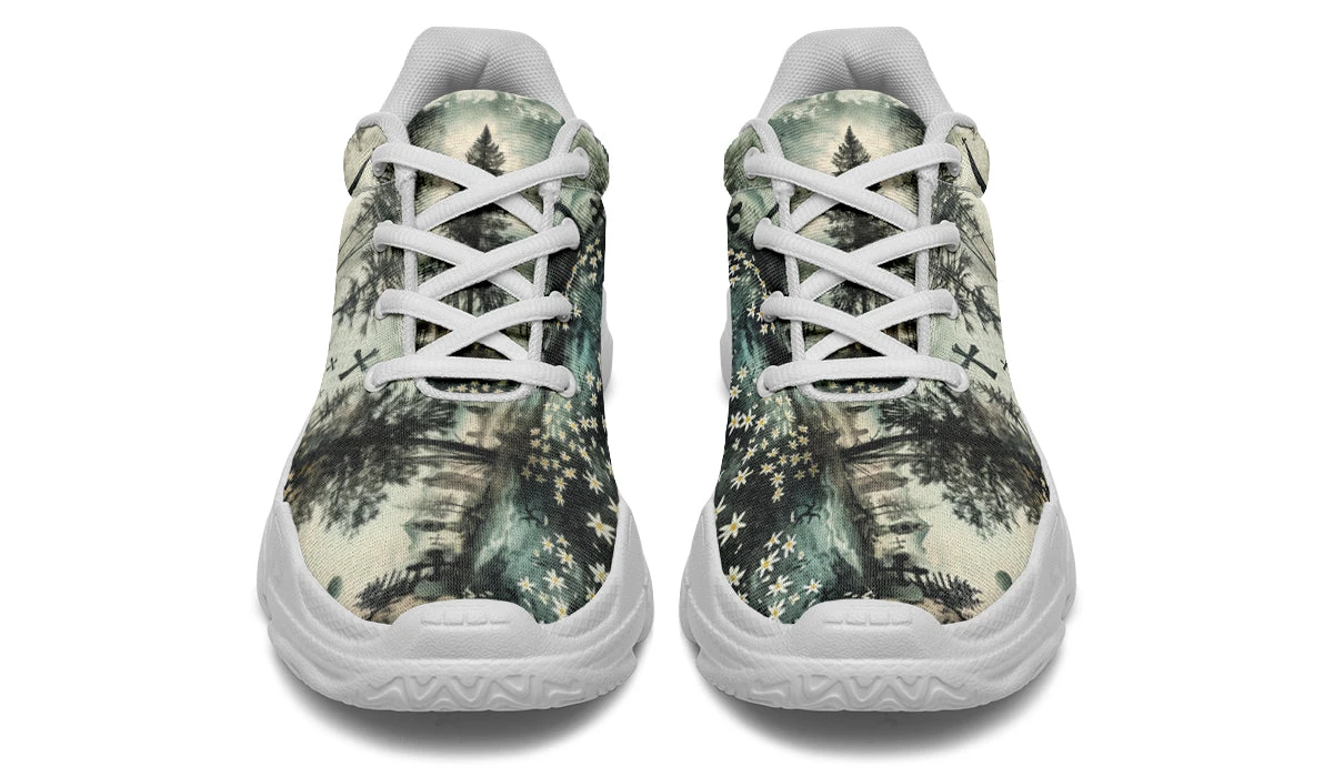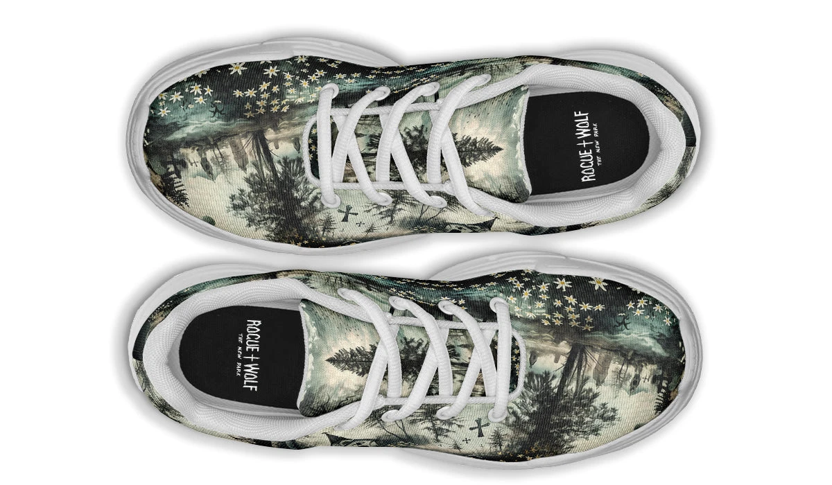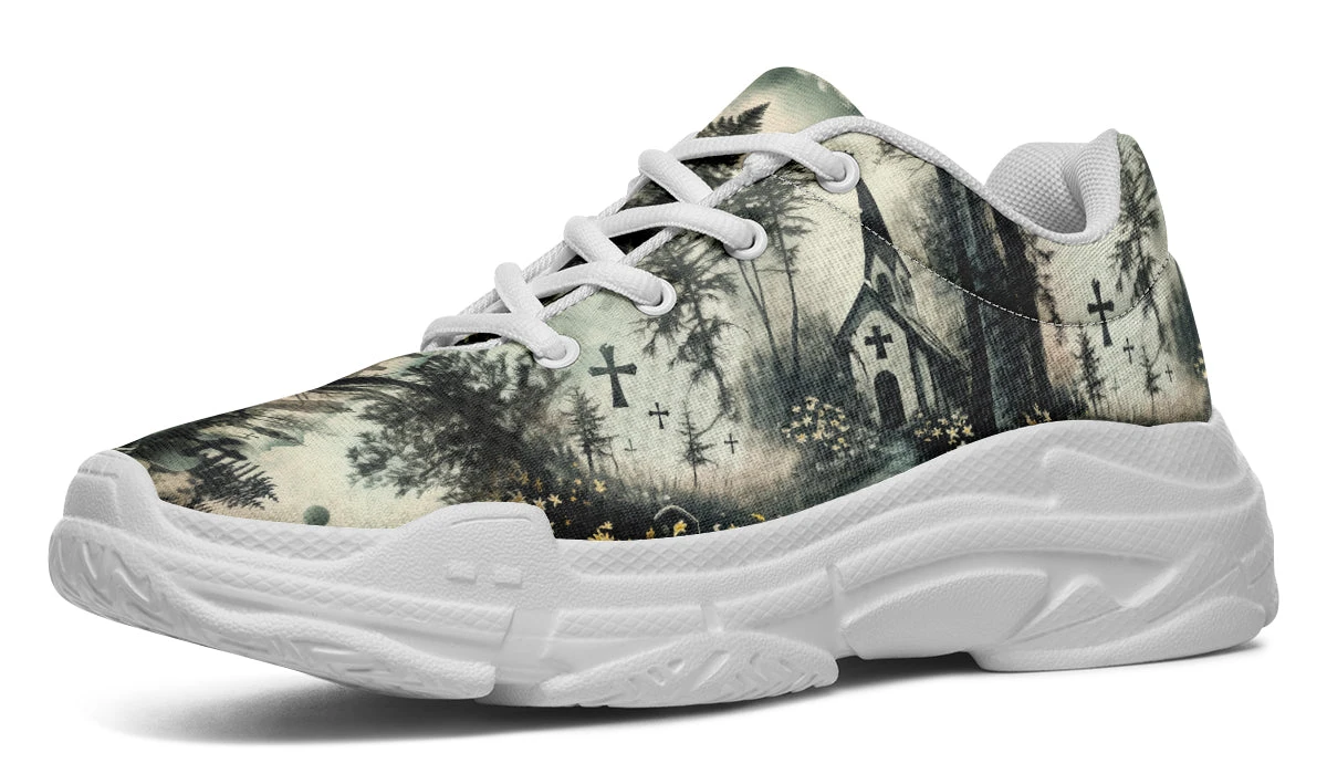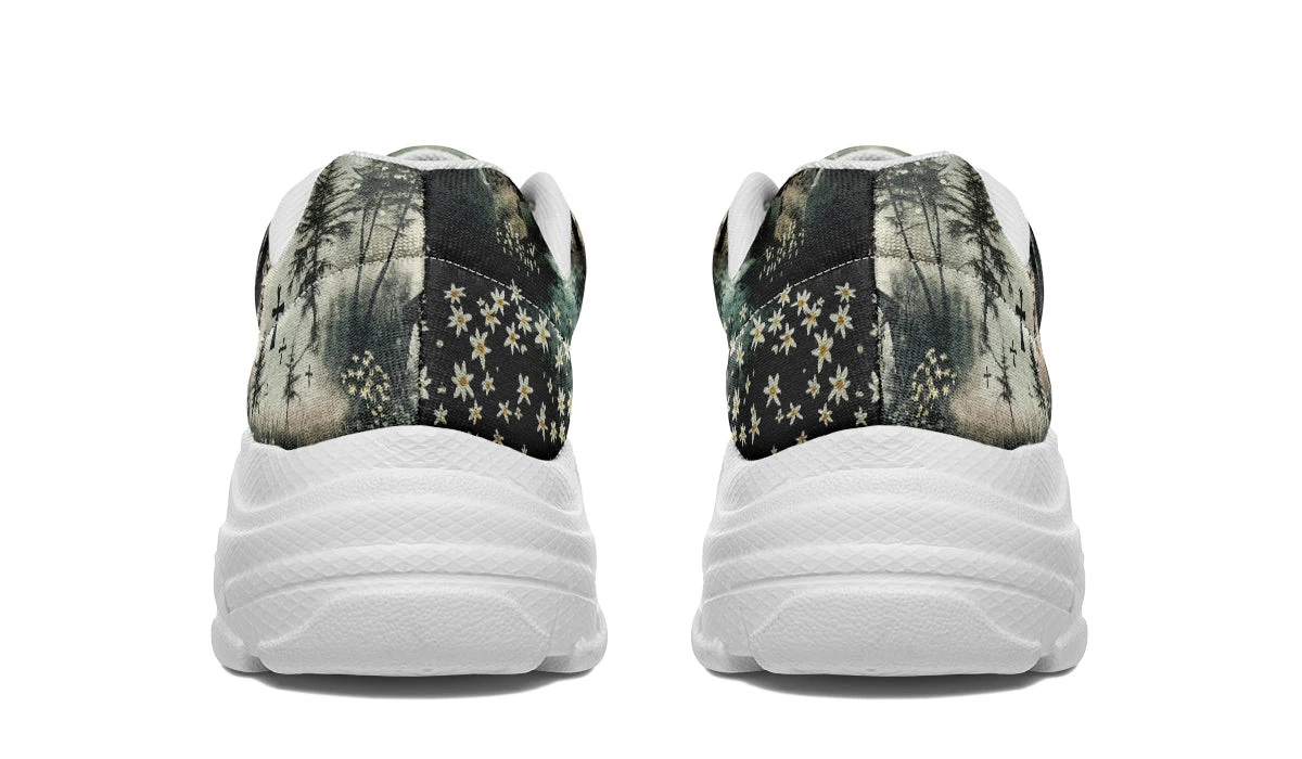 Add a dash of dark enchantment to your wardrobe with our Whispers in the Fog Chunky Sneakers. Each step you take is a journey through a moonlit forest where shadows dance, whispers wander, and daisies bloom amidst ancient churches and crosses.